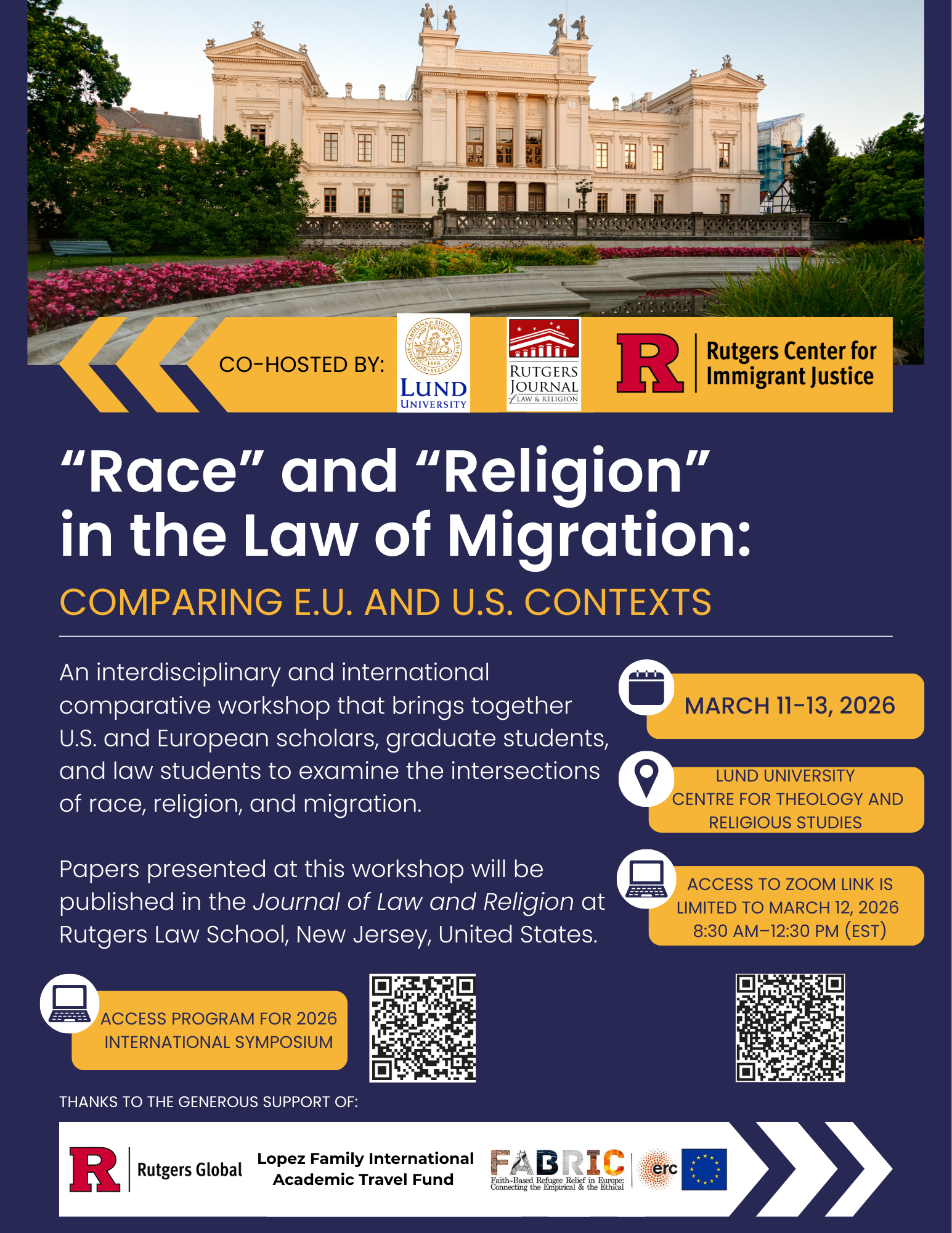 This colloquium examines the use of religious liberty rights to protect undocumented immigrants. Speakers include Professor Katherine Franke from Columbia Law School, Amy Gottlieb, Associate Regional Director of American Friends Service Committee, Jason Cortes, Associate Professor and Program Director, American Studies, Rutgers University, and Jorge Contesse, Associate Professor of Law, Rutgers Law School.